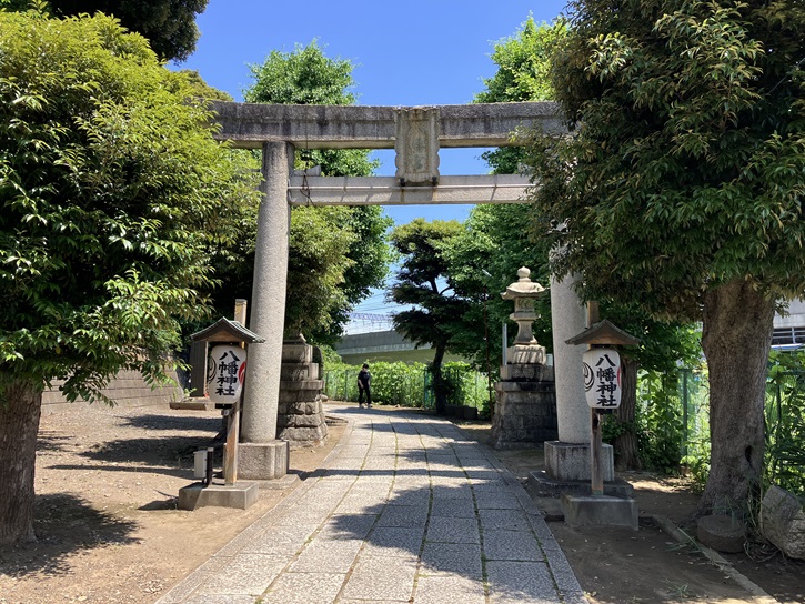 となっています。従って、この神社は、室町時代末期以前からあったことは確実です。また、「新篇武蔵風土記稿」に、「赤羽根村・・・今ハ東叡山及傳通院村内宝幢院八幡社領入會ノ村ナリ」と記されており、慶安二年(1649年、江戸時代)に七石余の朱印が付されていることから(「岩淵町郷土誌」)、江戸時代、この神社は、年貢・課役の免除を保証された領地を赤羽根村内に七石余有していたことも確実といえましょう。現在の本殿は昭和六年改築されたものです。その向かって右側に神楽殿がありますが、これは絵馬堂を兼ね、絵馬が三枚納められています。この神社が祀られている台地は、武蔵野台地の東北端にあたり、東は荒川沿岸の沖積地に、西は八幡ノ谷に面しています。そして、この境内からは縄文式土器・弥生式土器・土師器が発見されており、縄文時代中期・弥生時代後期・歴史時代の遺跡とされ、八幡神社遺跡と呼ばれていますが、学術調査はまだ行われていないようであり、詳細は不明です(「東京都遺跡地図」東京都教育委員会)。この神社より星美学園敷地(旧陸軍第一師団工兵第一大隊兵舎跡)、国立王子病院敷地(旧陸軍近衛工兵大隊兵舎跡)およびその周辺にかけての台上一帯(旧陸軍兵器支廠赤羽火薬庫、作業場等跡)は、八幡原と呼ばれ、坂上田村麻呂が陣を敷いたところという伝説があります。明治五年、稲付に旧陸軍の火薬庫が設けられ、同二十年、第一・近衛両工兵隊の移転があって以来、赤羽の台地には旧陸軍関係の施設の移転・拡張等があいつぎ、赤羽は「陸軍の町」となっていきました。この神社の境内にある工一記念碑や赤羽招魂社(旧工兵第一大隊兵舎内にあった招魂社。現在は赤羽町の戦歿者の霊も合祝)などは、その当時の名残りです。また、ここから星美学園に至る坂は、第一・近衛両工兵隊にちなんで工兵坂とも師団坂とも呼ばれています。