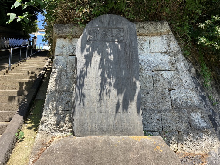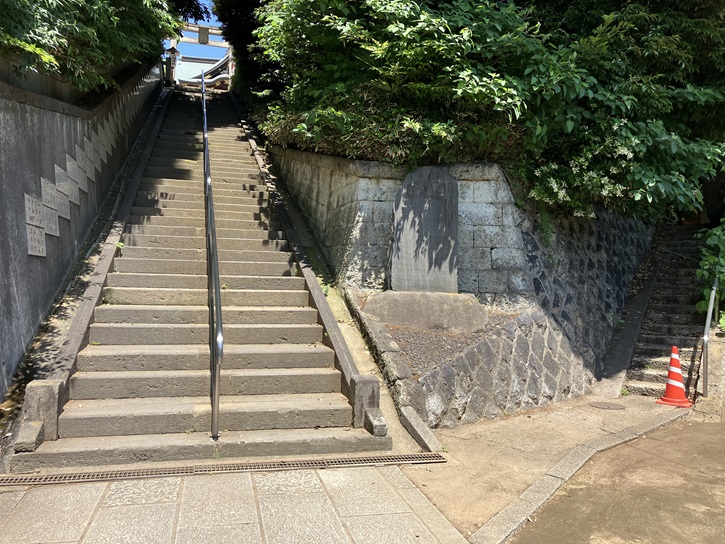 鳥居の奥に階段が左右に設けられています。左側は赤羽八幡神社の正面参道の男坂、右側はいわゆる女坂です。石段の下の男坂と女坂の間に「石坂碑」と刻まれた大きな石碑が建っています。碑文はなく、石坂の整備のために献金したと思われる多数の人名が刻まれています。
