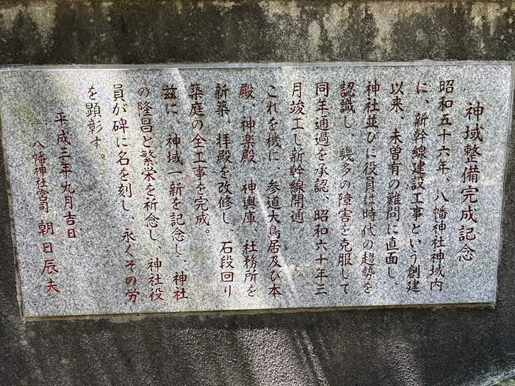 昭和五十六年、八幡神社神域内に、新幹線建設工事という創建以来、未曽有の難問に直面し、神社並びに役員は時代の趨勢(すうせい)を認識し、幾多の障害を克服して同年通過を承認、昭和六十年三月竣工し新幹線開通。これを機に、参道大鳥居及び本殿、神楽殿、神輿庫、社務所を新築、拝殿を改修し、石段回り築庭の全工事を完成。茲に、神域一新を記念し、神社の隆昌と繁栄を祈念し、神社役員が碑に名を刻し、永くその労を顕彰す。