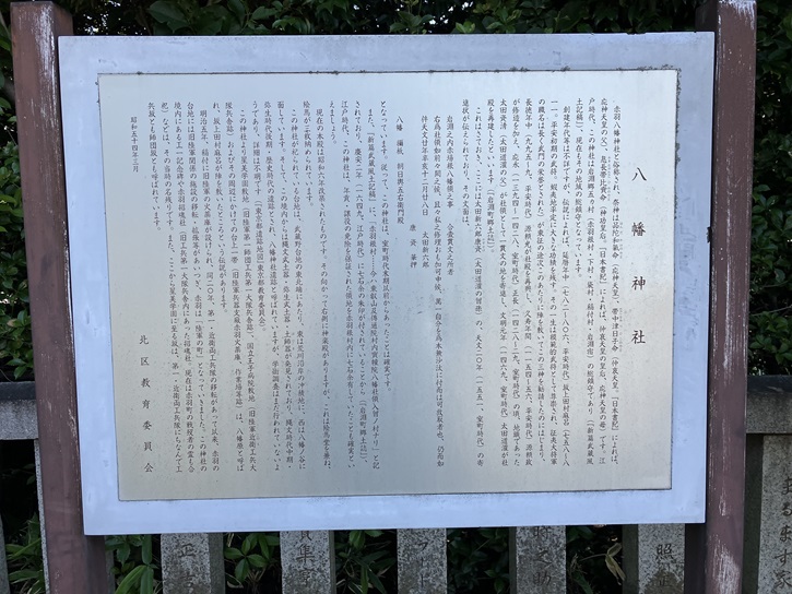 赤羽八幡神社と俗称され、祭神は品陀和気命(応神天皇)、帯中津日子命(仲哀天皇。「日本書紀」によれば、応神天皇の父)、息長帯比売命(神功皇后。「日本書紀」によれば、仲哀天皇の皇后、応神天皇の母)です。江戸時代、この神社は岩淵郷五ヵ村(赤羽根村・下村・袋村・稲村村・岩淵宿)の総鎮守であり(「新編武蔵風土記稿」)、現在もその地域の総鎮守となっています。創建年代等は不詳ですが、伝説によれば、延暦年中(782年〜806年、平安時代)坂上田村麻呂(758年〜811年。平安初期の武将。蝦夷地平定に大きな功績を残す。その一生は模範的武将として尊崇され、征夷大将軍の職名は長く武門の栄誉とされた)が東征の途次このあたりに陣を敷いてこの三神を勧請したのにはじまり、長コ年中(995年〜999年、平安時代)源頼光が社殿を再興し、久寿年間(1154年〜1156年、平安時代)源頼政が修造を加え、応永(1394年〜1428年、室町時代)正長(1428年〜1429年、室町時代)の頃、地頭であった太田資清(太田道灌の父)が社領として一貫丈の地を寄進し、文明元年(1469年、室町時代)太田道灌が社殿を再建したといいます(「岩淵町郷土誌」)。これはさておき、ここには太田新六郎康資(太田道灌の曾孫)の、天文二十年(1551年、室町時代)の寄進状が伝えられており、その文面は、