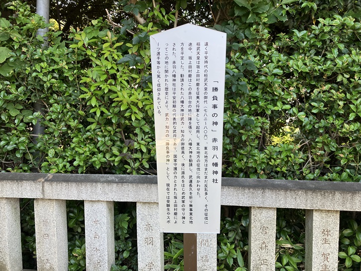 鳥居の脇には、赤羽八幡神社が「八幡宮」とも呼ばれていた頃の名残でしょうか、天保十一年(1840年)と刻まれた八旛宮の石碑が建っています。表には「八幡宮 是ヨリ左ヘ一丁(八幡宮へはここから左へ109メートル)」、側面には「坂上大宿稲田村麻呂延暦三年東征之時創建(坂上田村麻呂が延暦三年(784年)に東北を征伐する際に創建した)」との記載があります。