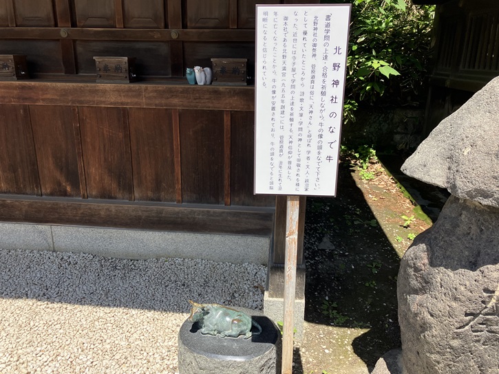 北野神社の御祭神、菅原道真は俗に「天神さん」と呼ばれ学者・文人・政治家として優れていたところから詩歌・文筆・学問の神として崇敬される様になった。近世には寺子屋で学問の上達を祈願する、天神信仰が普及した。御本社である北野天満宮(955年創建)には、菅原道真が丑年に生れて丑年に亡くなったことから、牛の像が安置されており、牛の頭をなでると頭脳明晰になると信じられている。