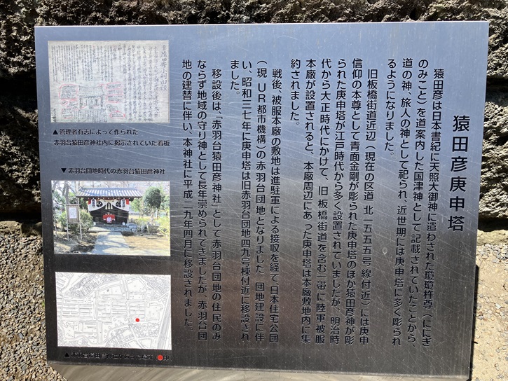 猿田彦は日本書紀に天照大御神に遣わされた瓊瓊杵尊(ににぎのみこと)を道案内した国津神として記載されていたことから、道の神、旅人の神として祀られ、近世期には庚申塔に多く彫られるようになりました。旧板橋街道近辺(現在の区道北1555号線付近)には庚申信仰の本尊として青面金剛が彫られた庚申塔のほか猿田彦神が彫られた庚申塔が江戸時代から多く設置されていましたが、明治時代から大正時代にかけて、旧板橋街道を含む一帯に陸軍被服本廠が設置されると、本廠周辺にあった庚申塔は本廠敷地内に集約されました。戦後、被服本廠の敷地は進駐軍による接収を経て、日本住宅公団(現UR都市機構)の赤羽台団地となりました。団地建設に伴い、昭和三十七年に庚申塔は旧赤羽台団地49号棟付近に移設されました。移設後は、「赤羽台猿田彦神社」として赤羽台団地の住民のみならず地域の守り神として長年崇められてきましたが、赤羽台団地の建替に伴い、本神社に平成二十九年四月に移設されました。