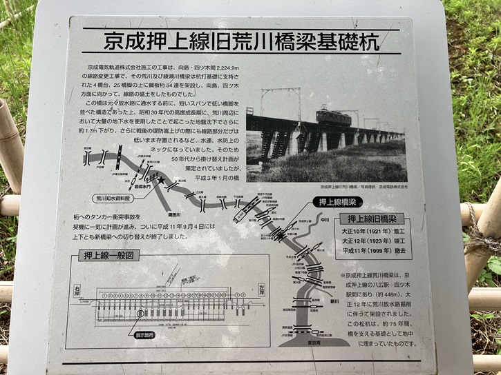 京成電気軌道株式会社施工の工事は、向島・四ツ木間2、224.9mの線路変更工事で、その荒川及び綾瀬川橋梁は杭打基礎に支持された4橋台、25橋脚の上に鋼板桁54連を架設し、向島、四ツ木方面に向かって、線路の盛土をしたものでした。この橋は元々放水路に通水する前に、短いスパンで低い橋脚を並べた構造であった上、昭和三十年代の高度成長期に、荒川周辺において大量の地下水を使用したことで起こった地盤沈下でさらに約1.7m下がり、さらに戦後の堤防嵩上げの際にも線路部分だけは低いまま存置されるなど、水運、水防上のネックになっていました。そのため50年代から掛け替え計画が策定されていましたが、平成三年1月の橋桁へのタンカー衝突事故を契機に一気に計画が進み、ついに平成十一年9月4日には上下とも新橋梁への切り替えが終了しました。