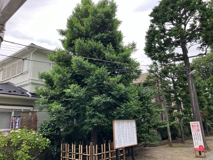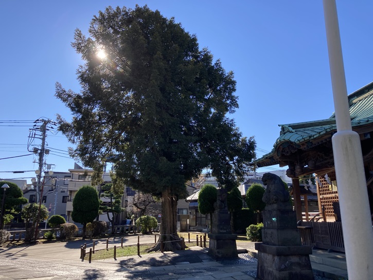 椰の木は遠く中国の海南島や台湾等に自生するが、太古黒潮ラインに乗り本邦南紀四国九州等の温暖な地方に定着したイチヰ科の雌雄異株の常緑の高木です。椰の木は伊豆半島が北限であると伝えられ、当神社の椰の故郷伊豆山神社には「此の木他国に稀なり」と記して有り、東京の北辺当神社で育つとはと感激して居ります(地球温暖化の為か)。椰の木は古代より神社の境内に植えられて居り、奈良の春日神社には平安朝900年頃の巨木有り、伊豆山神社には今を去る1千400年余年の昔、山岳信仰の道開きとも仰がれる役の行者(小角)が、