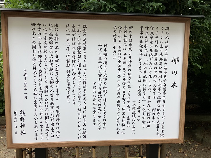 他にも椰の木の文献が数多く有りますが、当熊野神社の本宮紀州熊野那智大社周辺にも椰の木有り、新宮の熊野速玉大社には平重盛が植えたといわれる樹齢1、000年の椰の巨木有り、千古の昔より信仰厚く、当神社にも「縁結び」の神々が坐します。椰の木との関わり深く、神木として大切に生育したいと思います。