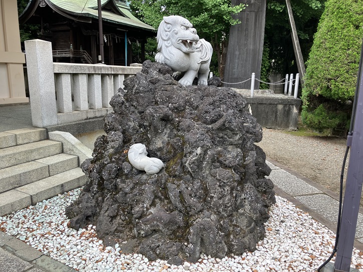 拝殿の前に一対の狛犬の親子が鎮座しています。熊野神社の狛犬は、大人と子供の狛犬が2頭ずついます。台座には大正六年(1917年)に建立されたと刻まれています。また、狛犬自体は「狛犬修復石碑」に平成十一年(1999年)に修復されたと書かれています。台座は富士山の溶岩を持ってきて造られたといわれています。参拝に来て拝殿前の階段を上がることができない人は、子供の狛犬の体に触れて願い事をすれば叶うとのことです。