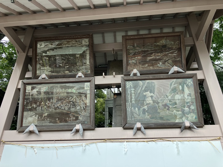 参道に面して4点の絵馬が掛けられています。左上の絵馬には、武将が闘っている様が描かれています。波頭が見えますので、壇ノ浦の合戦かもしれません。右上の絵馬には境内図が描かれています。宮島の厳島神社でしょうか?左下の絵馬には、右手にひときわ体の大きな人物がいて、左手には山伏姿の人物が数名見えます。酒呑童子退治の一場面を描いているようです。右下の絵馬には、有名な天岩戸の神話が描かれています。なかなかロマンがありますね。