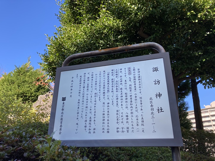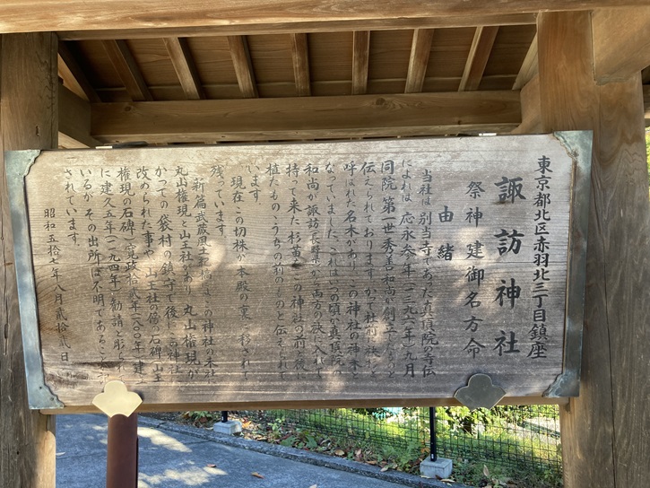 諏訪神社の由緒を記した古めかしい板書も掲示されています。