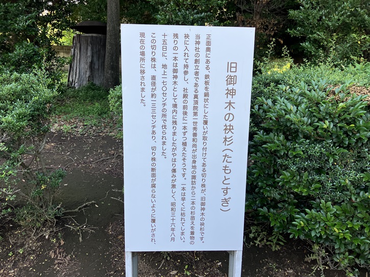 諏訪神社の境内には、かつて御神木とされていた杉の切り株「袂杉」があります。秀善和尚が故郷の諏訪から2本の苗を持ち帰り、社殿の前後に杉の木を植えたのです。社殿の後ろに植えられた杉の木は枯れてしまい、1961年8月に傷みの激しい部分が伐採され、地上から約170cmの高さの切り株になりました。袂杉の直径は約133cmの長さがあり、断面の保護のため鍋上の鉄板で覆われています。