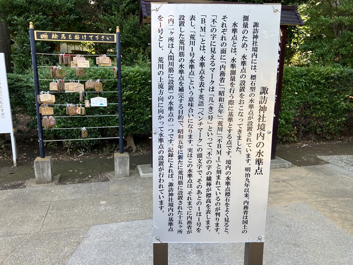 諏訪神社の境内には、水準点が設置されています。水準点とは、精度の高い高さ(標高)の座標値をもった基準点です。測量法では、日本の土地の高さ(標高)は平均海面からの高さで表示することが定められています。明治九年以来、内務省は国土の測量のため、水準点の設置を行ってきました。諏訪神社の水準点は荒川1号と呼ばれ、それまで荒川筋に既設した水準点を補完する目的で昭和五年に内務省によって新たに設置されました。