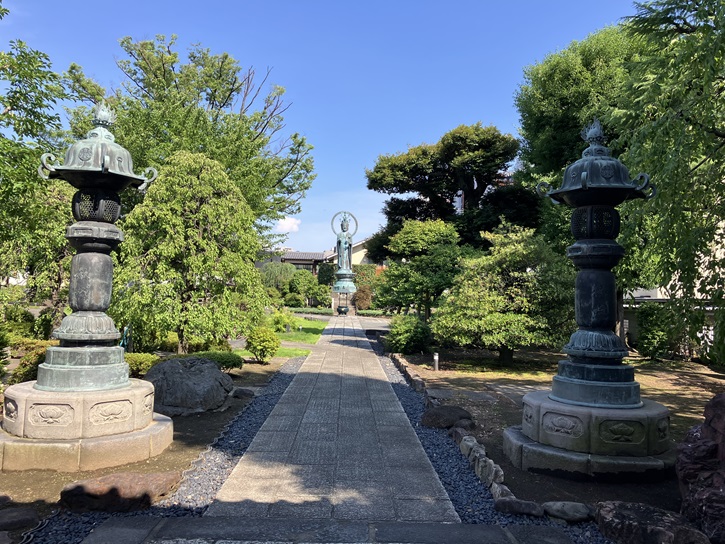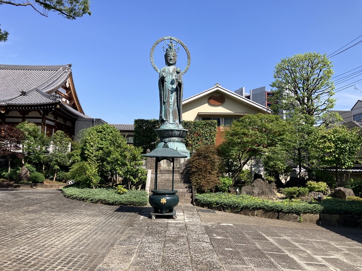 境内にある観音像は「岩淵大観音」と呼ばれ、高さは約10メートルで、明治三年(1870年)に建立されました。正光寺の周辺一帯は、かって近くを流れる荒川が氾濫して人々を悩ましていました。そこで、人々が金品を出し合って正光寺に観音像を造立し、荒川の平穏を祈ったのです。