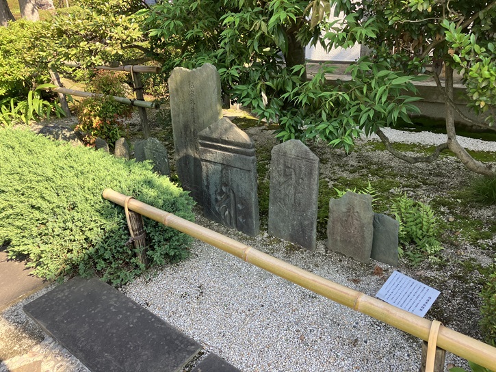 ここにある十一基の板牌は北区有形文化財(歴史資料)として指定されています。年代がわかるものとしては、中央の弘安九年(1286年)の銘のあるものが一番古く、これを含め鎌倉時代が二基、室町時代が三基あり、当時の人々の信仰の深さやあり方を今に伝えています。