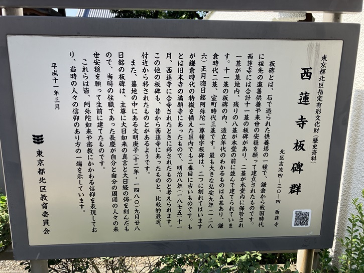 板牌とは石で造られた供養塔の一種で、鎌倉時代から戦国時代に祖先の追善供養や来世の安穏を願って建立されました。ここにある十一基の板牌は北区有形文化財(歴史資料)として指定されており、年代がわかるものとしては、中央の弘安九年(1286年)の銘のあるものが一番古く、これを含め鎌倉時代が二基、室町時代が三基あり、当時の人々の信仰の深さやあり方を今に伝えています。