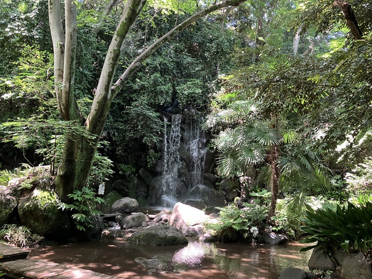 園内は回遊式の庭園となっていて、男滝・女滝・独鈷の滝・湧玉の滝の4つの滝が復元されています。これらの滝は地下水をポンプで汲み上げて水を流していて、滝から流れた水は小川となって園内を巡り大小の池に注ぐ仕組みになっています。