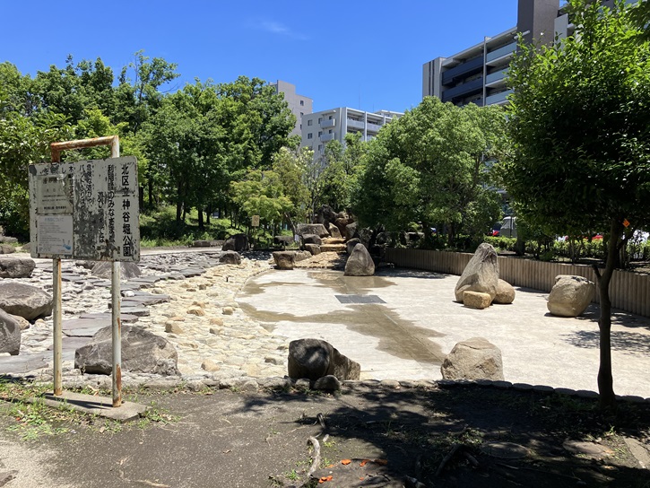 神谷堀公園はかつての「甚兵衛堀」の跡です。神谷堀とも呼ばれていました。昔、此の地は湿地帯で大雨や洪水の時には田畑に大きな被害が出ました。神谷堀は排水と農地造りのためにつくられたという説があります。また、明治期には堀が広げられ、舟運の便が良くなり、近代産業の発展に大いに役立ちました。戦後も、神谷堀は隅田川から北本通りを越えて王子製紙(戦後は十条製紙)の工場までを繋ぐ水路として使われました。1973年に工場が閉鎖された後、神谷堀は1977年にすべて埋め立てられました。その後、北本通り東側の大部分は北区の神谷堀公園になりました。あまり知られていませんが、東京メトロ南北線の王子車両基地はこの公園の下に建設されました。南北線の最初の計画では、岩淵町(現在の赤羽岩淵駅)から南西方向に向かい、東京陸軍兵器補給廠専用線跡(現在の赤羽緑道公園など)を引き込み線(延長2.2km)として、北区西が丘三丁目にある国立西が丘サッカー場横の敷地に車両基地を建設する計画でしたが、途中の桐ヶ丘団地住民の大きな反対運動が起こり、計画場所は変更されて陸上自衛隊武器補給処十条支処赤羽地区跡地(現在は赤羽自然観察公園となっている場所)に、地下2層構造・230両収容の大規模な車両基地(整備工場を含む)を建設する方針となっていました。これが実現していたら、赤羽台地域は現在と大きく景観が異なっていたことでしょう。