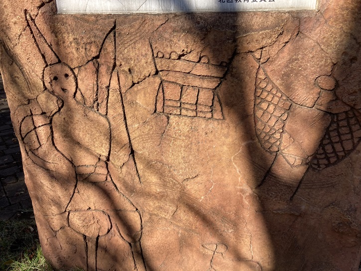 主な出土品が解説してあります。アーチ型の壁には、当時の生活の様子が彫られています。お祭りしているのかな?