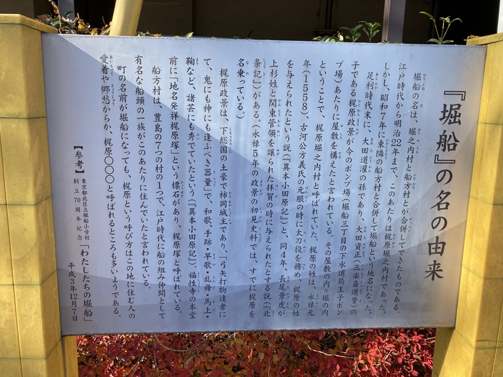 白山神社に隣接して、白山堀公園があります。この辺りの町名は「堀舟」ですが、その由来が書かれた案内板が立っています。