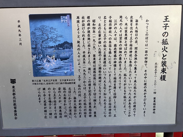 かつてこの辺りは一面の田畑で、その中に榎の木がそびえていました。毎年大晦日の夜、関東各地から集まって来た狐たちがこの榎の下で衣装を改めて王子稲荷神社に参詣したといういいつたえがあることから、木は装束榎と呼ばれていました。狐たちがともす狐火によって、地元の人々は翌年の田畑の豊凶を占ったそうです。江戸の人々は、商売繁盛の神様として稲荷を厚く信仰しており、王子稲荷神社への参詣も盛んになっていました。やがて、王子稲荷神社の名とともに王子の狐火と装束榎のいいつたえも広く知られるようになり、左の広重が描いた絵のように錦絵の題材にもなりました。昭和四年(1929年)、装束榎は道路拡張に際して切り倒され、装束榎の碑が現在地に移されました。後に、この榎を記念して装束稲荷神社が設けられました。平成五年(1993年)からは、王子の狐火の話を再現しようと、地元の人々によって、王子「狐の行列」が始められました。毎年大晦日から元日にかけての深夜に、狐のお面をかぶった裃姿の人々が、装束稲荷から王子稲荷までの道のりをお囃子と一緒に練り歩く光景が繰り広げられます。