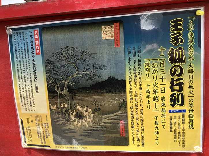 王子稲荷神社は東国三十三国稲荷総司との伝承を持つと共に、狐火の名所とされています。「王子の狐火(きつねび)」とは、江戸時代に郊外だった王子に現れた狐火にまつわる民話の伝承です。かって王子周辺が一面の田園地帯だった頃、路傍に「装束榎」と呼ばれた一本の大きな榎の木がありました。毎年大晦日の夜になると関八州(関東全域)の狐たちが松明を点してこの榎の木の下に集まり、正装を整えた後に官位を求めて王子稲荷へ参殿しました。狐火の行列は壮観で、近在の農民はその数を数えて翌年の豊凶を占ったと伝えられています。現在は、大晦日の夜に地元の人々によって狐の行列が催されています。