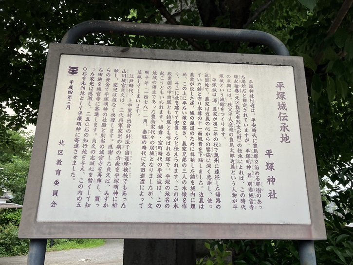 平塚神社付近は、平安時代に豊島郡を治める郡衙のあった場所だと推定されていますが、平塚明神并別当城官寺縁起絵巻(北区指定有形文化財)の伝承によれば、この時代の末期には、秩父平氏庶流の豊島太郎近義という人物が平塚城という城館をつくります。平塚城は源義家が後三年の役で奥州に遠征した帰路の逗留地で、義家は近義の心からの饗応に深く感謝し、使っていた鎧と守り本尊の十一面観音を下賜しました。近義は義家が没した後、城の鎮護のために拝領した鎧を城内に埋め、この上に平たい塚を築き、義家兄弟の三人の木像を作り、そこに社を建てて安置したと伝えられます。これが本殿裏側の甲冑塚とも鎧塚とも呼ばれる塚で、平塚の地名の起こりともいわれます。鎌倉・室町時代の平塚城は、この地域の領主であった豊島家代々の居城となりましたが、文明十年(1478年)一月、泰経の時代に太田道灌によって落城してしまいます。江戸時代、上中里村出身の針医で当道座検校でもあった山川城官貞久は、三代将軍家光の病の治癒を平塚明神に祈願し、家光は程なく快復します。感謝した貞久は、みずからの資金で平塚明神の社殿と別当の城官寺を再興し、買った田地を城官寺に寄進します。貞久の忠誠心を暫くして知った家光は感激し、二百五十石の知行地を与え、この内の五十石を朱印地として平塚明神に寄進させました。