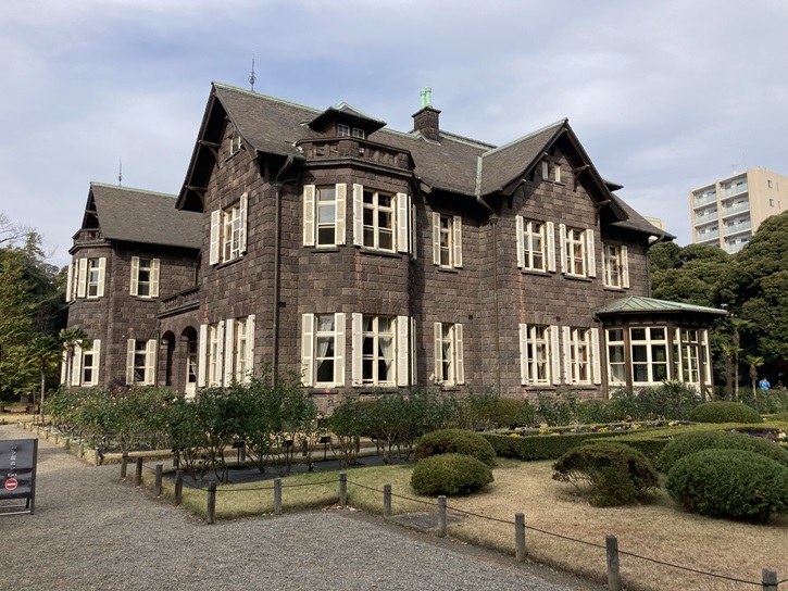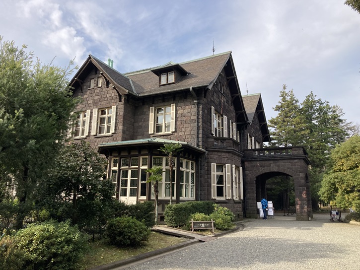 洋館は大正六年(1917年)5月竣工し、延べ414坪・地上2階・地下1階で、外観はスコティッシュ・バロニアル様式を目指したとされています。屋根はスレート葺きで、煉瓦造の躯体を黒々とした真鶴産の本小松石(安山岩)の野面積みで覆っているのが特徴的です。南側の庭園から見た外観は左右対称に近く、両脇に切妻屋根を据え、その間の部分は1階に3連アーチ、2階には高欄をめぐらしたベランダが設けられ、屋根にはドーマー窓を乗せています。全体的に野趣と重厚さに溢れ、スコットランドの山荘の風情を感じさせます。