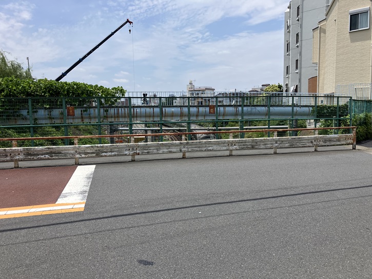 駒込駅方向には富士見橋の横に水道の本管が通っていて見通しがよくありません。富士山のかけらも見えませんね。田端駅方向に大きく曲がった線路の正面には東北新幹線の高架橋が望めます。