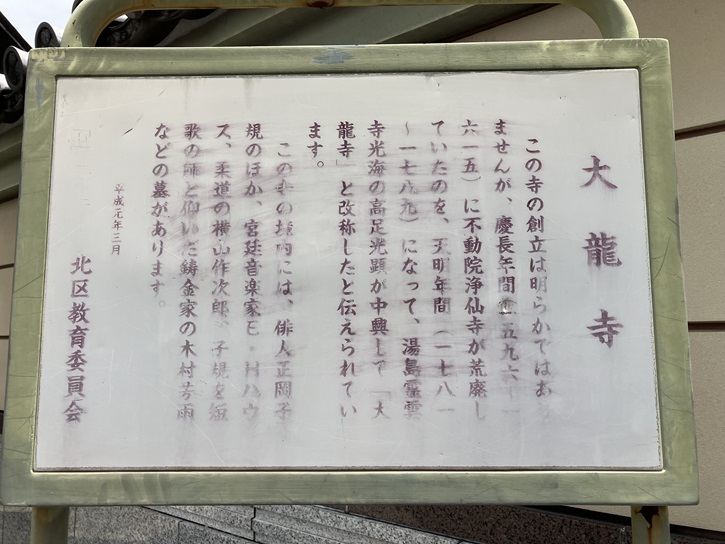 大龍寺には、近代日本を代表する俳人の正岡子規を始め、エドワード・ハワード・ハウス、横山作次郎、板谷波山、大川平三郎、木村芳雨、井上達也の墓があります。子規は、生前に「静かな寺に葬って欲しい」と言っていたとされていて、死後に大龍寺が選ばれて葬られました。これに因んで、大龍寺は子規寺とも呼ばれています。