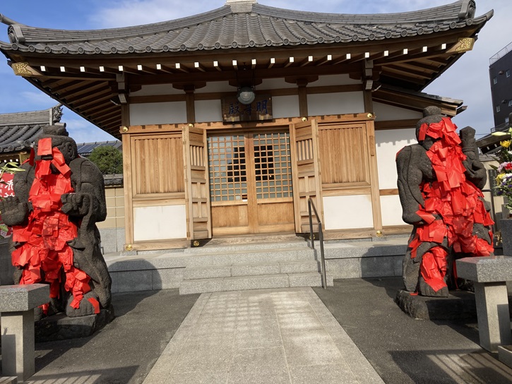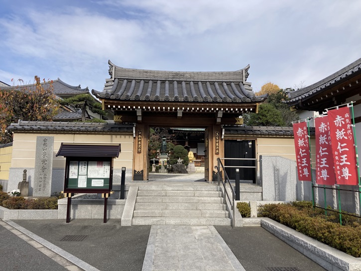護摩堂の前に2体の金剛力士立像が仁王立ちなさっています。頭のてっぺんから足元まで赤紙(悪魔を消除する火の色)で埋め尽くされていますが、これは仁王様の全身に赤い紙を貼り付けて、病気の身代わりを祈願するという風習です。