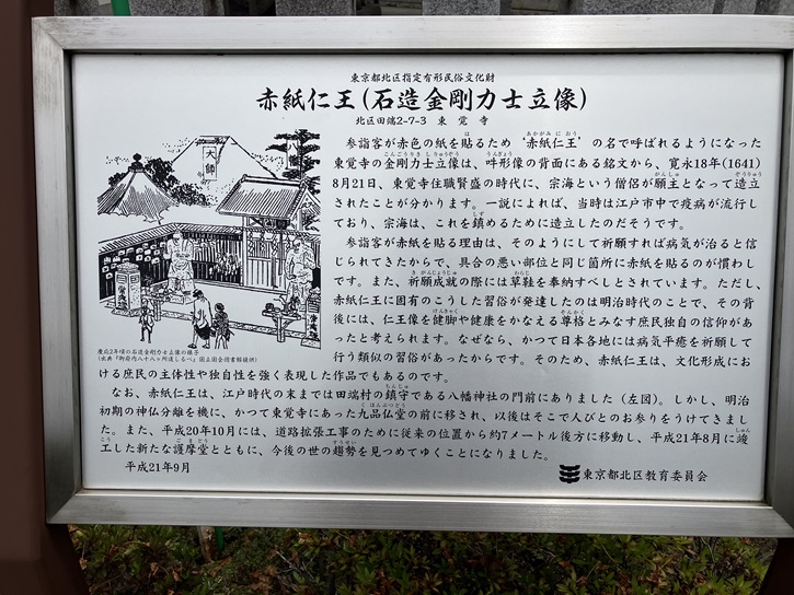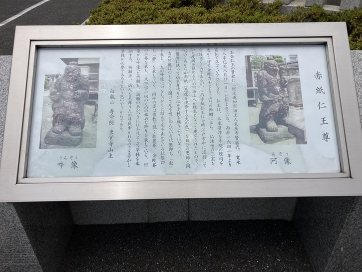 石仏仁王の背銘に「施主道如宗海上人東岳寺賢盛代、寛永十八辛巳天八月廿一日」と刻まれている。西暦1641年より露仏で立っていることになる。仁王は、本来清浄な寺院の境内を悪から守る金剛力士として山門の両側に立ち、仏法僧の三宝を守護するものであるが、この赤紙仁王は当時江戸市中に流行していた疫病を鎮めるため宗海上人が願主となって建立されたもので、いつのころからか赤紙(悪魔を焼徐する火の色)を自分の患部と同じ箇所に貼って病気身代りと心身安穏を願うようになった。右の阿像は口を大きく開けて息を吸い込んでいる状態即ち「動」を表し、左の吽像は口をしっかりと結んで息を止めている状態即「静」を表している。阿吽の姿は密教で説く胎蔵界、金剛界の二界を表し、又宇宙一切のものの始めと終りを表している。阿像から吽像へと祈願し、満願のあかつきにはお礼として草鞋を奉する。祈願者、病人を見舞うため日夜歩かれるのでさぞかし草鞋が必要であろうという思いやりからである。