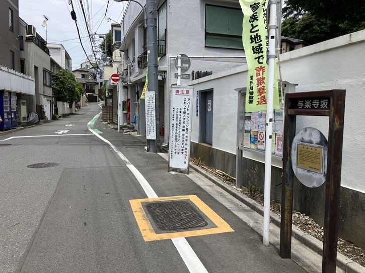 田端文士村記念館から田端駅前通りを渡った先の住宅地の中を進みますと、左手に坂が上がっています。与楽寺坂は長さが約130mほどの左右に曲がりながら上る緩やかな坂です。坂名は、坂下にある与楽寺に由来しています。坂下付近に案内板が立っています。