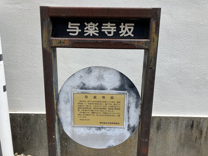 坂の名は、坂下にある与楽寺に由来しています。「東京府村誌」に「与楽寺の北西にあり、南に下る、長さ二十五間広さ一間三尺」と記されています。この坂の近くに、画家の岩田専太郎、漆芸家の堆朱楊成、鋳金家の香取秀真、文学者の芥川龍之介などが住んでいました。芥川龍之介は、書簡のなかに「田端はどこへ行っても黄白い木の葉ばかりだ。夜とほ(通)ると秋の匂がする」と書いています。