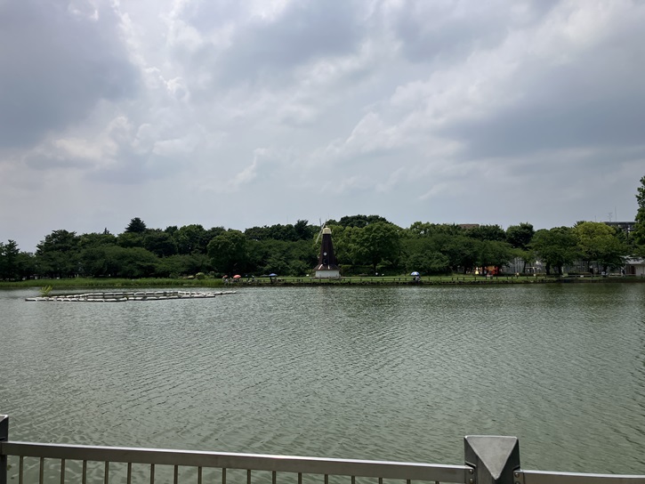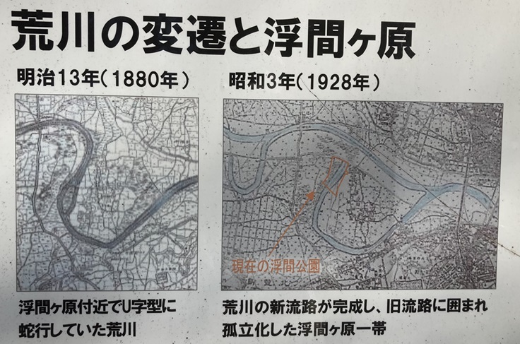浮間公園は、東京都北区浮間二丁目と板橋区舟渡二丁目の境にある浮間ヶ池を中心にした都立の都市公園(総合公園)です。江戸時代から明治時代にかけて、浮間付近で荒川は大きく南に蛇行していました。昭和三年(1928年)頃に荒川が直線化された際、荒川の旧流路の一部が取り残され、その名残りとして浮間ヶ池ができました。それまで荒川の左岸側(埼玉県側)だった浮間は、このとき右岸側(東京府側)になりました。浮間ヶ池はU字蛇行部の西の一部にあたり、池の東にある現在の浮間地区が荒川改修で埼玉県側から移った町域に相当します。昭和四十二年(1967年)、東京都は浮間ヶ池を含めた周辺地域を都立浮間公園としました。昭和六十年(1985年)に浮間舟渡駅が開業すると、浮間公園の入り口は駅前広場と道路一つを隔てて相対する現在の姿になりました。
