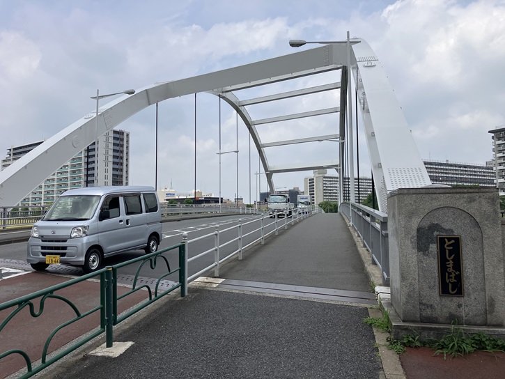 豊島橋は、長さ106.7m・幅15mのローゼ桁橋で、現在の橋は平成十三年(2001年)に架橋されました。現在の橋の上流300メートルほどの隅田川が大きく蛇行する「天狗の鼻」と呼ばれる場所に、鎌倉時代から続くとされる「六阿弥陀の渡し」(豊島の渡しともいわれます)があり、六阿弥陀詣の人々で賑わったと伝わっています。大正十四年(1925年)、この場所に最初の豊島橋が木橋として架けられました。初代の豊島橋は荒川に架けられた同じく木橋の旧江北橋と結ばれていましたが、老朽化によって昭和三十五年(1960年)に下流の現在の位置に両橋共々ゲルバー式鋼製桁橋として改架されました。