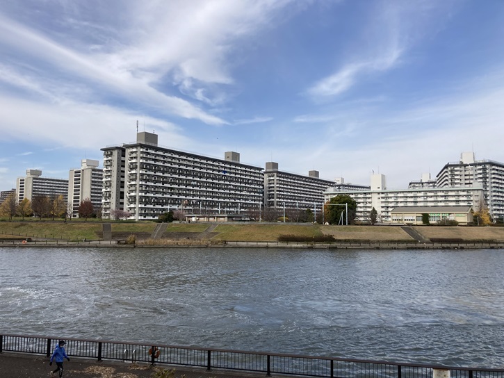 荒川と隅田川に挟まれた足立区の新田地区に高層マンションが建ち並んでいます。ここは1996年3月まで操業していたトーアスチール製鉄所の工場跡地約20ヘクタール(東京ドーム5つ分)を再開発し、ハートアイランド新田という大規模高層住宅街に変貌させたとのことです。この一帯は、水害や地震に弱い東京東部エリアの対応力を高めるために、スーパー堤防として地面が高くかさ上げされ、地盤の強化と洪水時も浸水しない防災拠点となっています。さらに電線をすべて地中に埋め込む無電柱方式で街づくりされているため、震災時も街の機能を保つことができます。