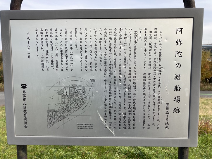 宮城ゆうゆう公園の直ぐ先に、「阿弥陀の渡船場跡」の案内板が立っています。阿弥陀の渡船場は、豊島村から沼田村(足立区)への渡しでした。かつて、旧荒川(現隅田川)の流路は「天狗の鼻」と呼ばれるほど大きく湾曲し、渡船場はこの天狗の鼻の頭よりやや下流に位置していました。明治四十四年(1911年)から荒川放水路の河川改修工事が開始され、江北橋が大正十二年(1923年)に現荒川に、豊島橋が大正十四年(1925年)に現隅田川にそれぞれ架橋され、阿弥陀の渡船場も姿を消していきました。
