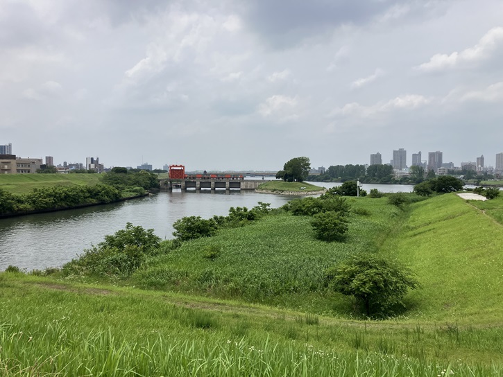 鹿浜橋から「岩淵水門(青水門)」に向かいます。鹿浜橋の先の荒川と並行して流れる隅田川には、現在唯一運行されている渡し舟があります。但し、これは日本化薬の工場と研究所を結ぶ専用の舟で、一般の人は利用できません。