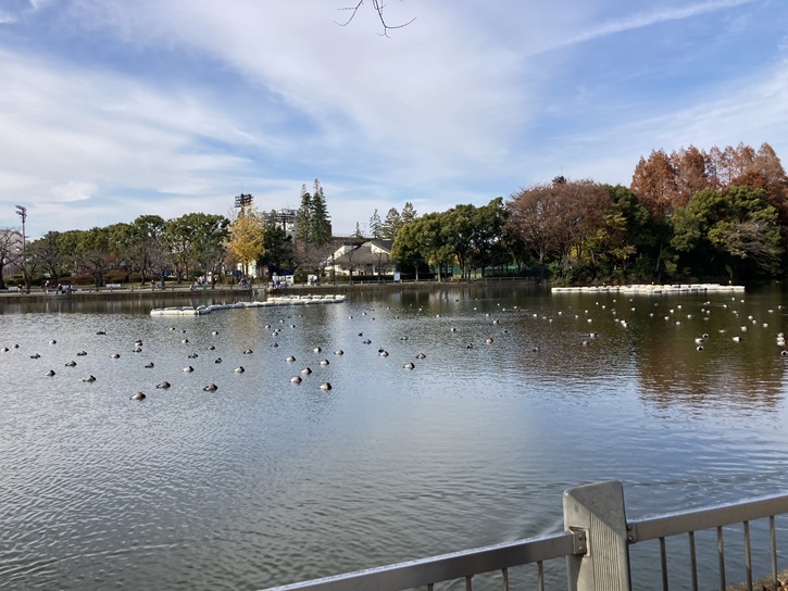 春には桜やツツジ、梅雨時にはアジサイが美しく咲き、秋にはケヤキが美しく紅葉します。また、晩秋からはカモなどの渡り鳥が多く集まります。公園の北側は保護区になっているので、オオヨシキリやコジュケイ、ウグイスなど街中ではあまり見ることのできない小鳥の鳴き声が聞かれます。
