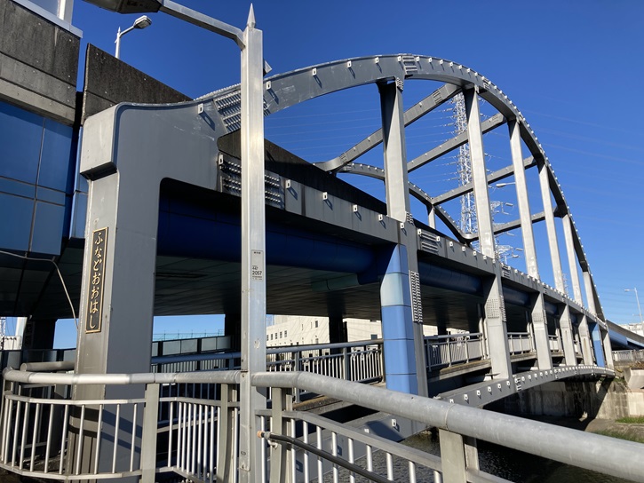 舟渡大橋は、都道447号赤羽西台線の新河岸川に架かるアーチ型の二重構造の橋で、上部は車両・下部は歩行者専用の歩車分離式の橋になっています。