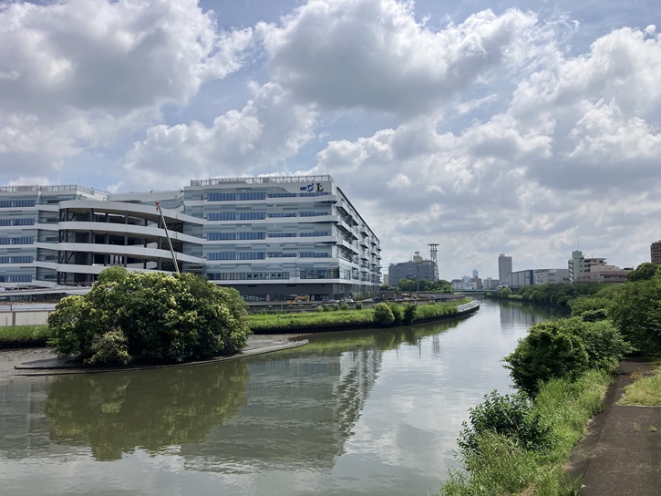 舟渡大橋の新河岸川下流側は大きく変形しているため、橋からの景色が面白く、映画やTVドラマなど様々な作品でロケ地として撮影が行われています。2021年に訪れた時は左岸側は何もない空き地でしたが、2024年現在はその場所に巨大な物流施設が建っています。「MFLP・LOGIFRONT東京板橋」という名称で、延床面積約77、400坪を誇る都内最大の物流施設になるのだそうです。物流施設として最高レベルのスペックを実現し、さらに未来のドローン物流を見据えたR&D区画も整備されるとのことです。殺風景な場所ならロケ地に向いているのでしょうけど、こんなに真新しい巨大なビルが背景だと、ドラマのストーリーにそぐわなくなりそうです。