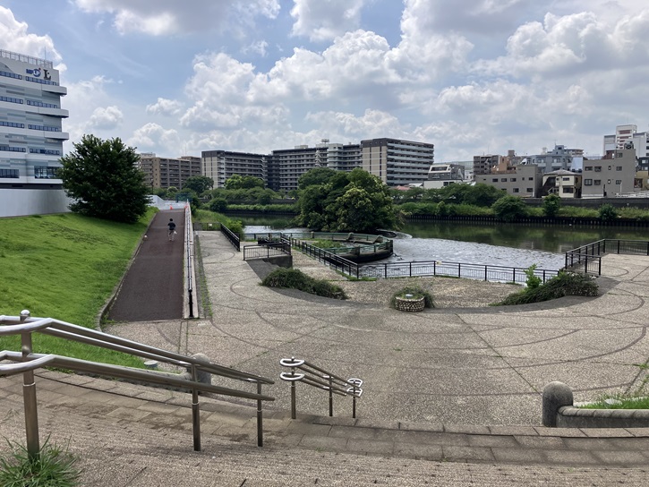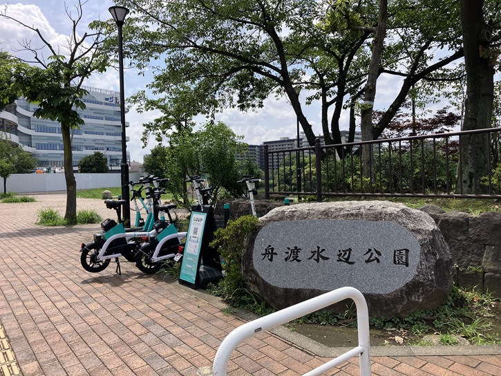 舟渡大橋を渡ったところに「舟渡水辺公園」があります。舟渡水辺公園は、旧荒川の河道跡(蛇行跡)を入江として整備した親水公園です。新河岸川沿いに位置し、親水テラスがある他、健康器具が多く設置されています。