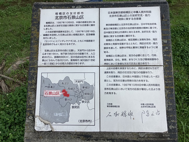 板橋区は、1997年10月8日、中国の首都北京にある石景山区と友好交流協力関係に関する合意書に調印しました。この友好都市提携を記念して、1997年12月18日、板橋区を訪問した石景山区長と板橋区長が、記念植樹を行いました。「エンジュ」と「シダレヤナギ」は、ともに中国原産で北京市内でもよく見かける木です。石景山区は北京市の西に位置し、天安門から区の中心まで約16km、地下鉄で約20分の距離です。人口約30万人、面積約86平方キロメートル、区の名前は区内にある石景山にちなんで名付けられ、夏商時代(紀元前21世紀〜前11世紀)からの悠久の歴史があります。
