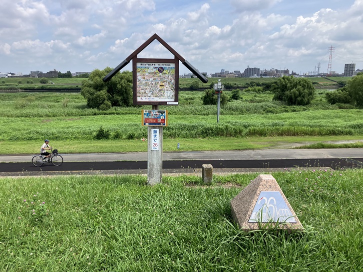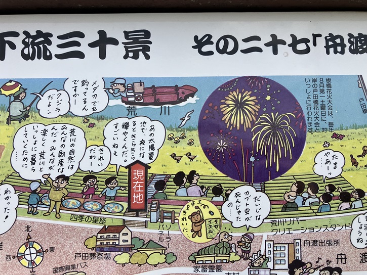 気のせいか、河川敷に向かう土手の斜面が階段状になっています。ひょっとして、これは花火の観覧席仕様になっているのでしょうか?板橋区内の代表的な観光名所には、「板橋十景」と書かれた石柱が建っています。これは、平成十五年2月に板橋区の区制70周年を記念して区民の応募により選定されたものです。「いたばし花火大会」は、その3番目になります。ちなみに、今回の板橋区散策コースでは、これら十景(「田遊び」の重複を加味すると十一景になりますが)全てを訪れることが目標です。