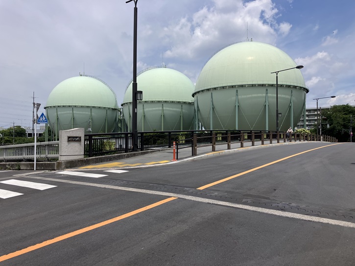 徳丸橋の上流左岸には、東京ガス板橋整圧所の3つ並んだガスタンクが見えます。菅田将暉さんと有村架純さんが主演し、2021年1月29日に公開された恋愛映画「花束みたいな恋をした」でロケ地になったみたいです。