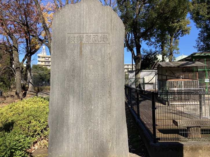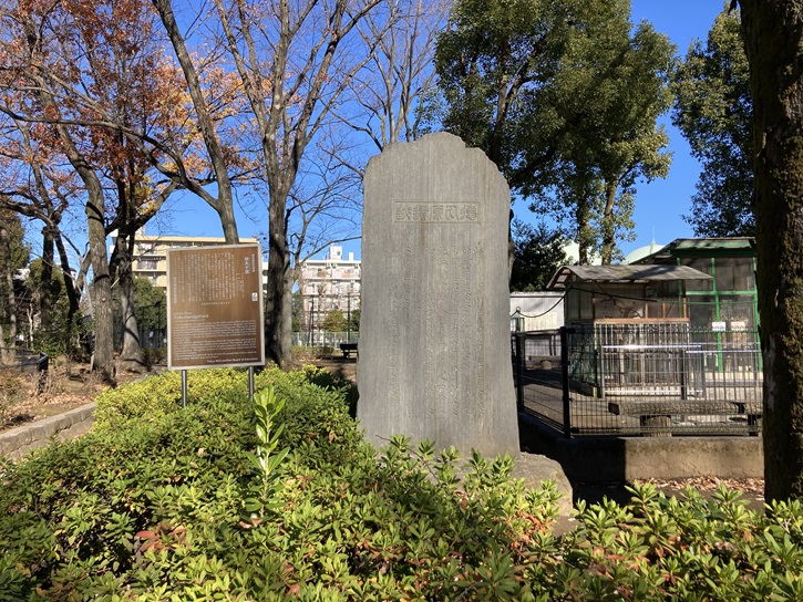 Tokumarugahara is a generic name for the whole place which spread on the south bank of Arakawa River including Takashimadaira, Shingashi and Misono. It had been a hunting ground for the Tokugawa Shogunate. During the period of the 8th Shogunate Yoshimune, it was turned into the firing range, and designated an official training ground for canons in 1792. This place became famous for the western gunnery exercise by Takashima Shuhan (an artillerist in the late Edo period) in 1841. In 1840, Shuhan reported to Shogunate about the Opium War, and proposed that we should reinforce the western-style armament. The exercise and the ballfiring held in Tokumarugahara and let people to perceive the ability of the western gunnery. This public exercise in Tokumarugahara raised fame of the Takashima Gunnery. This monument has been built on the Bentenzuka mound that Shuhan stood on at the exercise, but later was moved here.