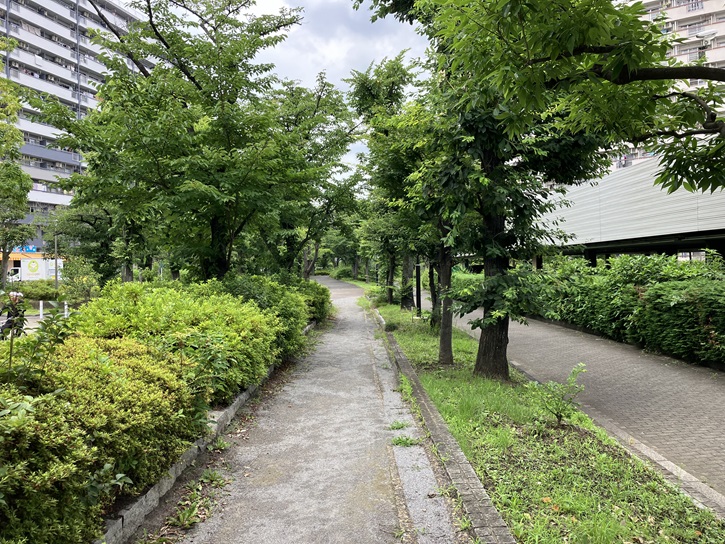 高島平団地とけやき並木から、六の橋通りを進んで「前谷津川緑道」に向かいます。
