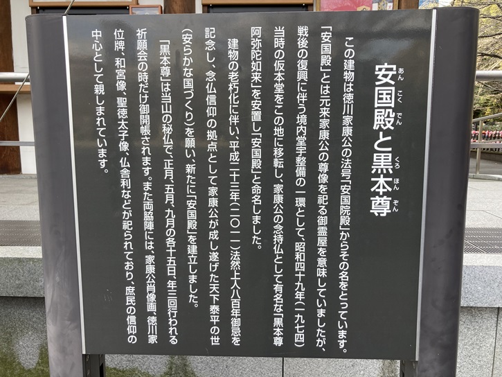 この建物は徳川家康公の法号「安国院殿」からその名をとっています。「安国殿」とは元来家康公の尊像を祀る御霊屋を意味していましたが、戦後の復興に伴う境内堂宇整備の一環として、昭和四十九年(1974年)当時の仮本堂をこの地に移転し、家康公の念持仏として有名な「黒本尊阿弥陀如来」を安置し「安国殿」と命名しました。建物の老朽化に伴い、平成二十三年(2011年)法然上人八百年御忌を記念し、念仏信仰の拠点として家康公が成し遂げた天下泰平の世(安らかな国づくり)を願い、新たに「安国殿」を建立しました。「黒本尊」は当山の秘仏で、正月、五月、九月の各十五日、年三回行われる祈願会の時だけ御開帳されます。また両脇陣には、家康公肖像画、徳川家位牌、和宮像、聖徳太子像、仏舎利などが祀られており、庶民の信仰の中心として親しまれています。