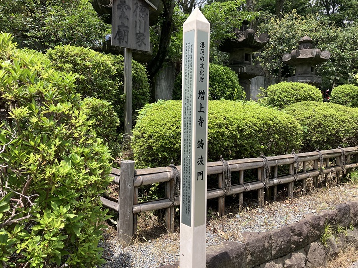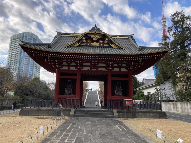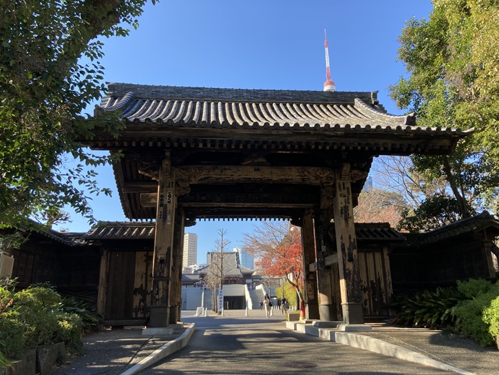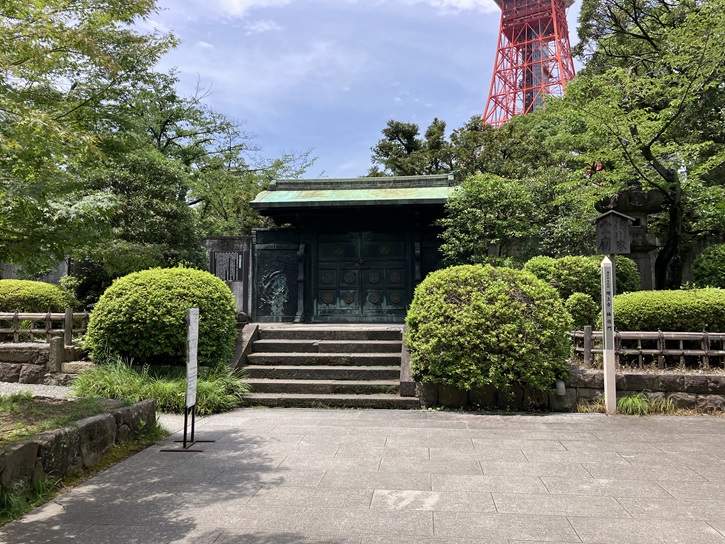 惣門から「増上寺(徳川将軍家菩提寺)」に向かいます。惣門の先に、年代を感じさせる「黒門」があります。黒門は、増上寺方丈(僧侶の居住する住居または仏教の修行場)の表門であった旧方丈門で、三代将軍徳川家光の寄進・建立とされています。明治時代に増上寺方丈に北海道開拓使の仮学校や海軍施設が置かれ、その後芝公園となって鐘楼堂脇に移築したものを、昭和五十五年に通用門として日比谷通り沿いに移築されました。
