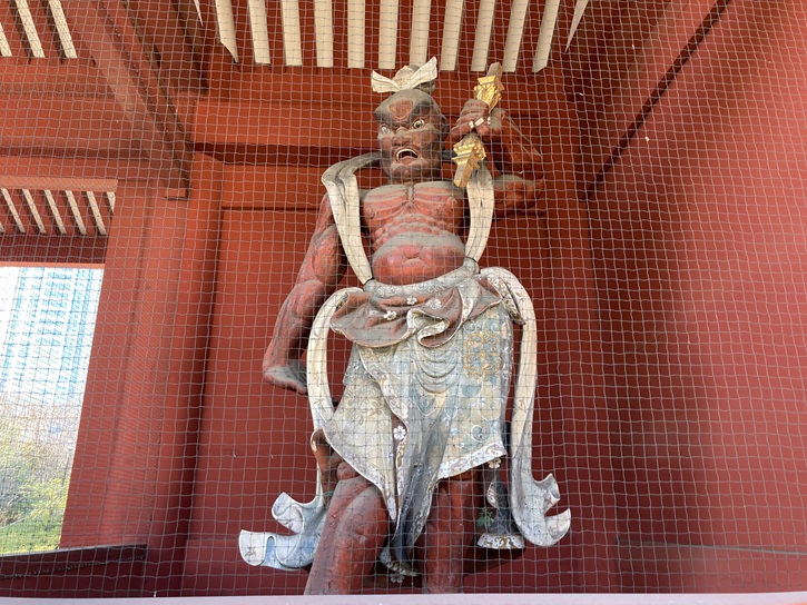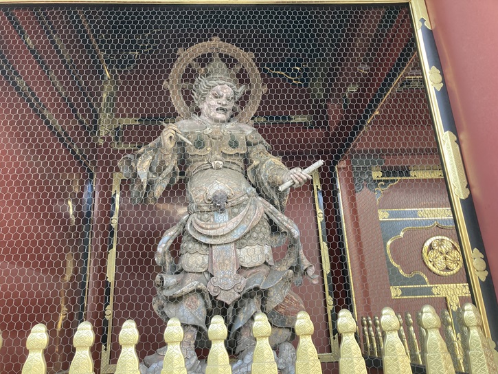重要文化財「旧台徳院霊廟惣門」の左右に安置している寄木造り、砥粉地彩色の仁王像で、方形の台座に乗った岩坐の上に立っています。平成十六年から十七年に行われた修理の際に、体内から修理銘札が発見され、元は埼玉県北足立郡戸塚村(現在の川口市西立野)の西福寺(真言宗)仁王門に安置されていたもので、寛政元年(1789年)、弘化三年(1847年)の二度にわたり修理が行われていることがわかりました。さらに安政二年(1855年)の暴風で破損したまま同寺の観音堂の片隅に置かれていたものを、昭和二十三年(1948年)、同寺三重塔の修理と同時期に三度目の修理が行われた後で、東京浅草寺に移されたことも記載されています。その後の経緯は詳らかではありませんが、昭和三十三年ごろまでにはこの惣門に安置されたと考えられます。本像は十八世紀前半までには江戸の仏師によって制作されたと推測され、江戸時代の仁王像として破綻のない作行きを示す貴重な作品です。