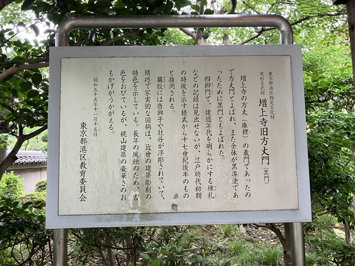 増上寺の方丈(庫裡)の表門であったので方丈門とよばれ、また全体が黒漆塗であったために黒門ともよばれた。四脚門で、建造年代を明らかにする棟札などの記録は見出せないが、江戸時代初期の特徴を示す様式から十七世紀後半のものと推測される。蟇股には唐獅子や牡丹が浮彫されていて、精巧で写実的な図柄は、近世の建築彫刻の特色を示している。長年の風蝕のため、古色をおびているが、桃山建築の豪華さのおもかげがうかがえる。